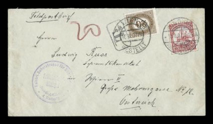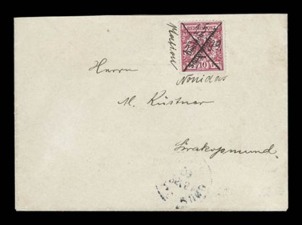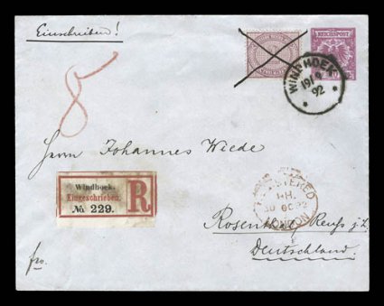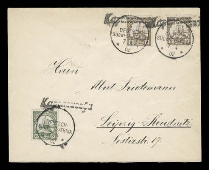 a 25pf value, one cover with a complete set of the 1899 Overprints, sevGerman South West Africa interesting cover lot of 37 items, most are better covers that were purchased on an individual basis at auction or retail, some forerunners including a 25pf value, one cover with a complete set of the 1899 Overprints, several better and desirable cancels including some scarce manuscript postmarks tying the stamps, a few Feldpost negative pmks., and much more; an excellent lot of scarce and desirable covers. (imagea) (imageb) (imagec) (imaged) (imagee) (Image) Est. $2,000-3,000
