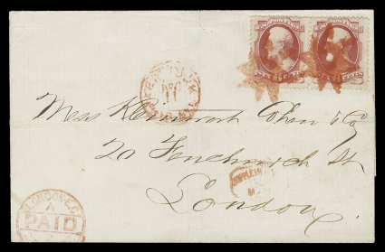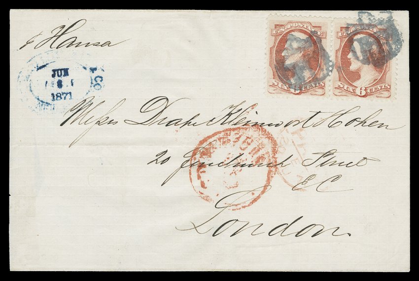 stamps tied by rare fancy NYFM shield cancels, both covers simil#148, 6c Carmine, a single and a horizontal pair tied to matching pair of 1871 folded entires from the same correspondence, New York City to London, England, each cover with stamps tied by rare fancy NYFM shield cancels, both covers similarly postmarked with red New York c.d.s. and London Paid cancels, London arrival c.d.s. on reverse, and each with blue double oval Ferdinand Hertz & Co. business sender's cachets at top left, very fine; the single stamp cover paying the normal 6c treaty rate, while the pair pays the double rate; a lovely and rare pair of covers perfect for a single exhibition page. (imagea) (Image) Est. $1,500-2,000