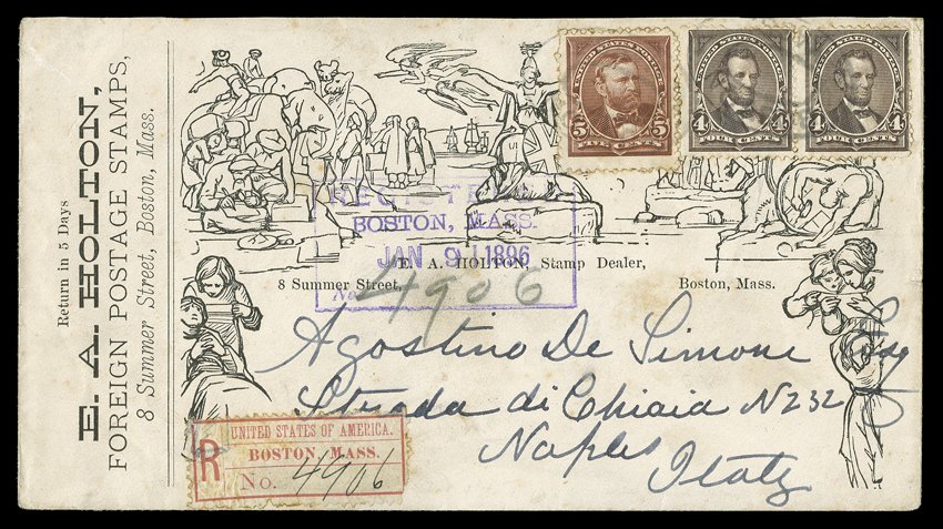 collection of its kind likely to have ever been formed, as each of t#304, 5c Blue, the remarkable foreign destination postal history collection/accumulation of over 120 covers, this incredible assemblage is the most comprehensive and fascinating collection of its kind likely to have ever been formed, as each of these covers were painstakingly and patiently assembled by Mr. Ainsworth over many years, selecting as many different foreign destinations as he could find, often acquiring more than one from several countries if the usage was particularly interesting, like uncommon advertising covers such as an illustrated gun cover to Buenos Aires, Argentina, or colorful illustrated exposition covers to Germany, just a sampling of the many scarce destinations found in this collection include Bahamas, Ceylon, China, German East Africa, Gold Coast, Iceland, Japan, Palestine, Russia, Turkestan and many others too numerous to mention, adding to the desirability of this group is the presence of a number of covers with special use stamps on them, such as foreign postage dues, officially sealed, etc., plus several are used from places outside of the continental U.S. like Hawaii, Puerto Rico and Samoa, about two-thirds of the covers have been mounted and are well annotated, with dozens more waiting to be mounted, included in the group are a few better domestic uses, but nearly all are foreign destinations, condition varies however the vast majority are fine-very fine; without question this collection could immediately contend for a gold-medal at any level. (Image) Est. $4,000-5,000