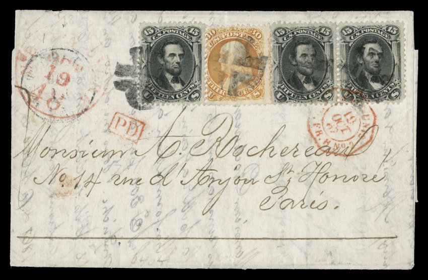 impressive quintuple rate franking, the former with two 15c Bla#77, 15c Black, along with 30c Orange (#71), two especially handsome 1867 covers, both addressed to Paris, France, one showing a quadruple rate franking, while the other being an impressive quintuple rate franking, the former with two 15c Black (pair and a single) and one 30c Orange, tied by circle of wedges cancels and red "New York/Paid/Aug 10/48" c.d.s., latter with three 15c Black and one 30c Orange, all tied by "crossroads" cork cancels, sent from New Orleans, red "48" New York credit c.d.s., red French transit postmark also ties the 15c pair, very fine; both covers are most appealing and would make a perfect exhibition page to show these two high value rates. (imagea) (Image) Est. $500-750
