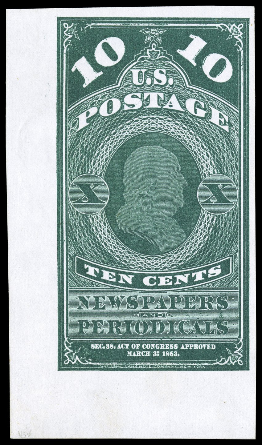 Postmaster General Alexander N. Zevely, without gum as issued, sma#PR3S var., 25c Orange red, manuscript "Specimen" overprint and "A.N.Z.", a most unusual specimen that is the only one recorded, the "A.N.Z." initials being those of the Third Postmaster General Alexander N. Zevely, without gum as issued, small corner crease and a tiny pinhole, otherwise very fine; a highly important item for the Newspaper stamp specialist or exhibitor; 1987 PF certificate; ex-Kotanchik. (Image) Est. $1,000-1,500