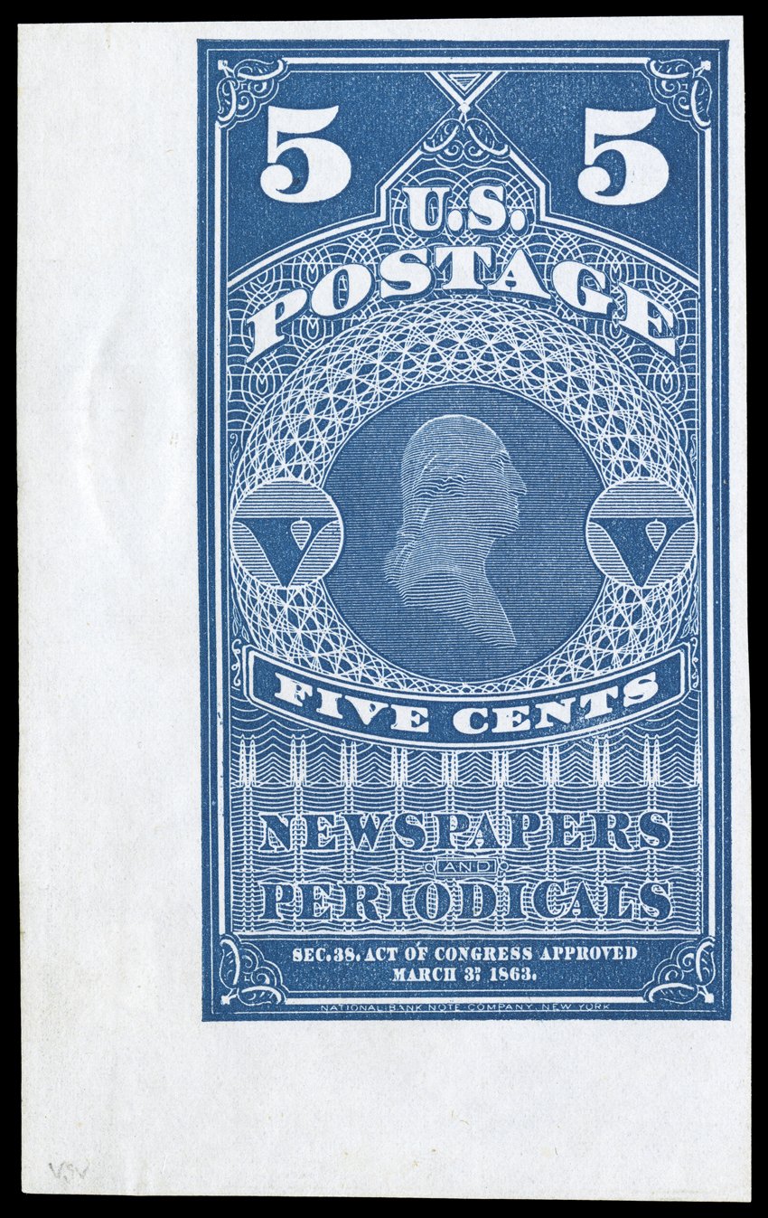 wonderfully well margined all around, in addition to being bright and fres#PR5 var.-PR7 var., 5c-25c 1875 Continental special printings of the 1865 Newspapers, imperforate, a marvelous matched set of bottom left corner sheet-margin singles, each wonderfully well margined all around, in addition to being bright and fresh, intense colors, extremely fine; a handsome and rare set; it is thought that only two sheets of each value were printed (one complete set of sheets we believe still remains intact), leaving only ten possible sets of singles available to collectors; each lightly signed as Special Printings by E. Costales. (imagea) (imageb) (Image) Est. $4,000-5,000