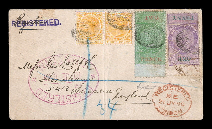 lot card, wide range of usages, includes nineteen with the early tallNew Zealand postal fiscals on cover desirable group of 39 covers mostly from the 1882-1945 period, most of which were bought individually and are still on the original auction lot card, wide range of usages, includes nineteen with the early "tall" issues, several of which are to foreign destinations, including France, Germany, England, Ireland, Tasmania, Canada, U.S. and Hawaii, some are mixed frankings with postage stamps, denominations on this issue range from 1p to 4/-, with the later issues going as high as 12/6, and a $4.00 stamp from 1987, a few WWII censored, condition a little mixed as expected, but mostly fine-very fine; an incredible opportunity to obtain a large number of scarce or rare covers at one time; eighteen are accompanied by Sismondo certificates. (imagea) (imageb) (imagec) (imaged) (imagee) (imagef) (imageg) (Image) Est. $3,000-4,000