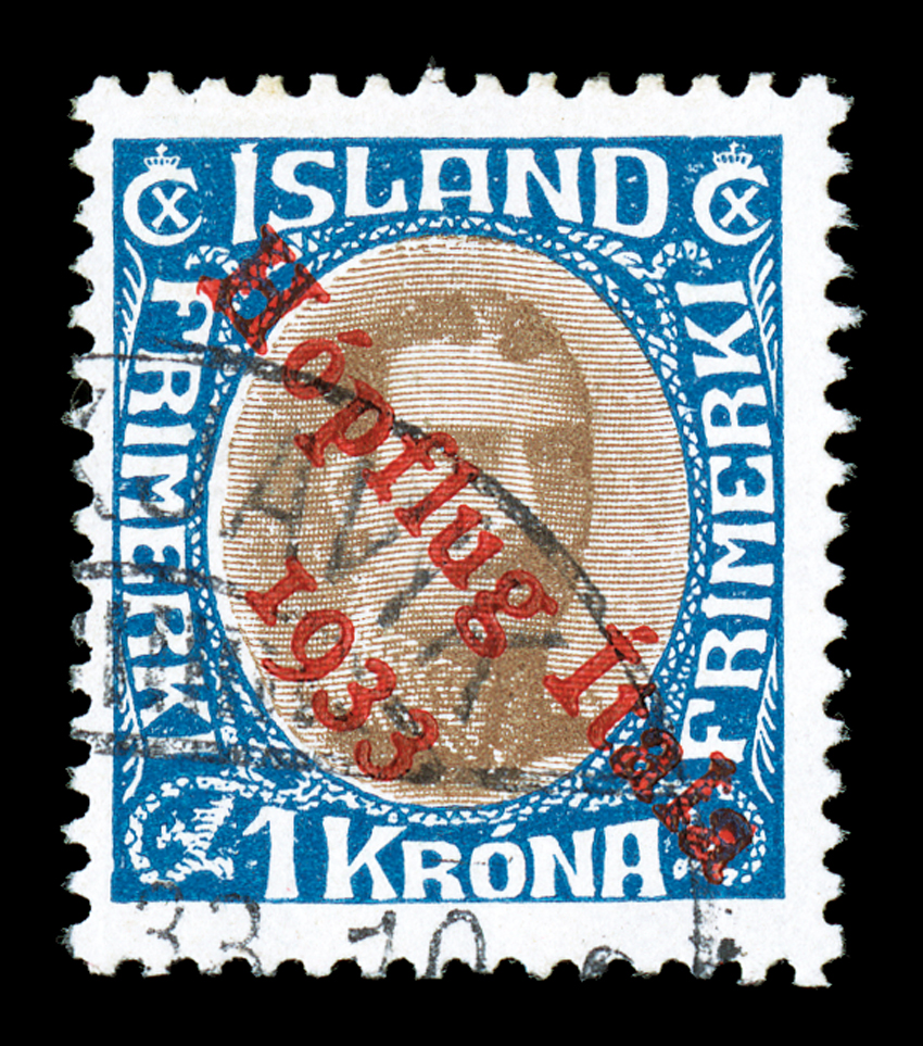 SK5,500).#31, 1897 3a on 5a Green, large type, perforated 13, tied to piece by Reykjavik c.d.s., well centered, fresh and very fine; 1998 Nielsen certificate (Facit #35; SK5,500). (Image) $600.00