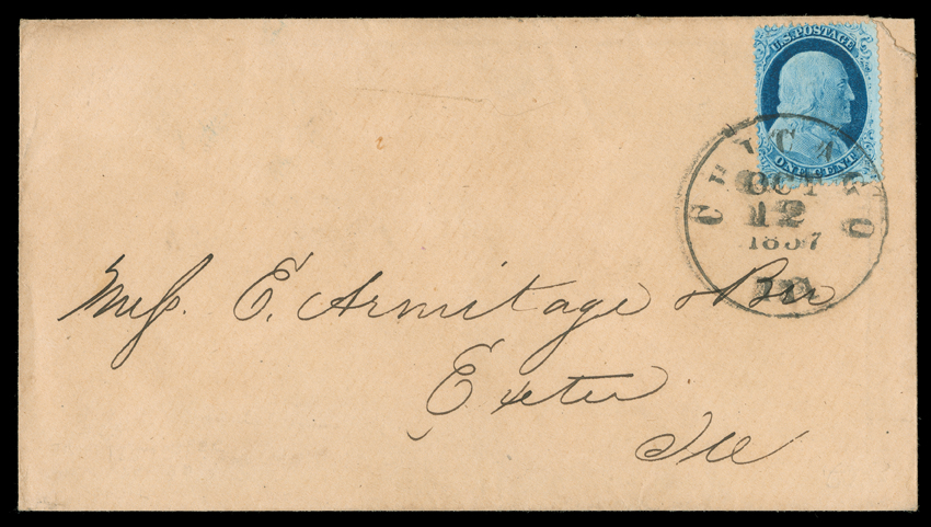 addressed to Exeter, Ill. by nice strike of Chicago, IllOct 141857 c.d.#23, 1c Blue, Ty. IV, triple transfer, one Inverted, position 71L1L, attractive example of this rare and collectible position, deep rich color, tied to buff colored cover addressed to Exeter, Ill. by nice strike of "Chicago, Ill/Oct 14/1857" c.d.s., fine; very few covers exist franked with this variety. (Image) off cover $4,000.00