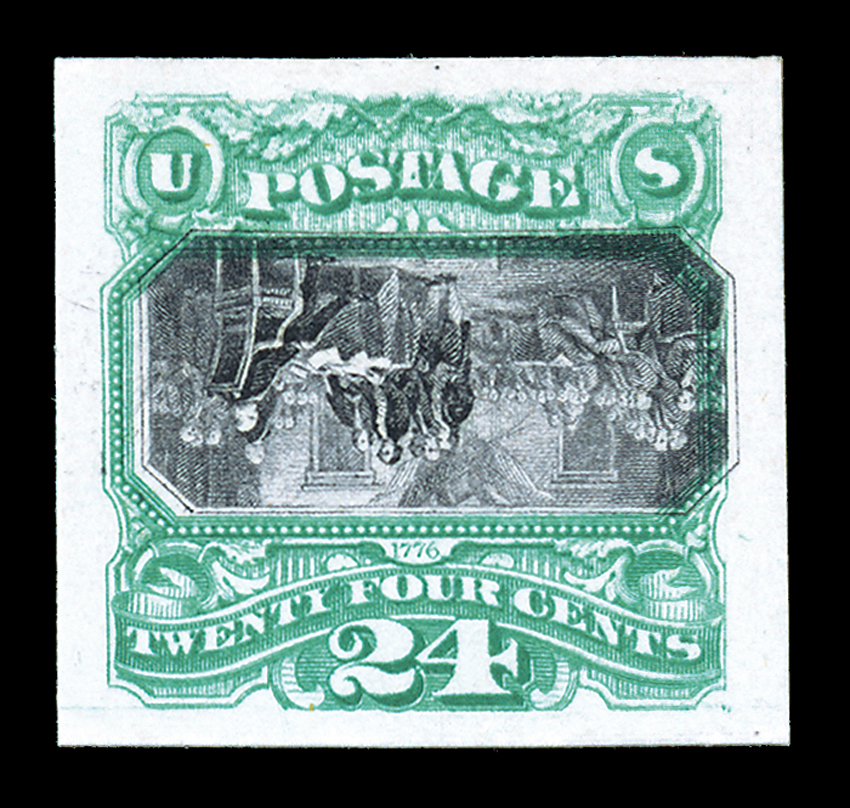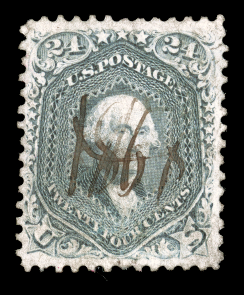 Foundation, the other is found on the famous ex-Isleham and Drucker co#78d, 24c Gray, printed on both sides, Inverted Impression on back, a used example of this great rarity, one of just two having been certified as genuine by the Philatelic Foundation, the other is found on the famous ex-Isleham and Drucker cover, interestingly both the Cunliffe example offered here and the one from the cover display almost identical backside impressions, which show portions of two stamps at top which are inverted to the front impression, clearly they must have come from the same sheet, the front of the stamp is exceptionally well centered within uncharacteristically large margins, plus its color is quite strong, neat central "1867" manuscript cancellation, there is a small defect at bottom right which has been neatly repaired and does not affect its very fine appearance, nor is it terribly relevant given this stamp's unique off cover status; one of the most important printed on both sides varieties of the 19th century; 1965 PF certificate. (imagea) (Image) $25,000.00