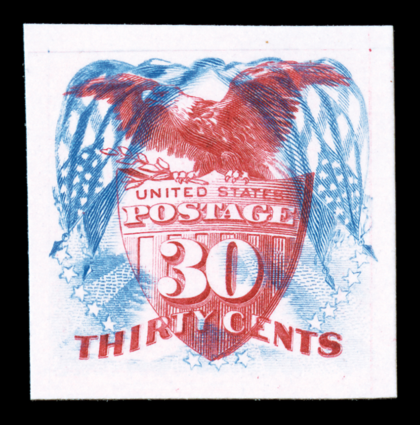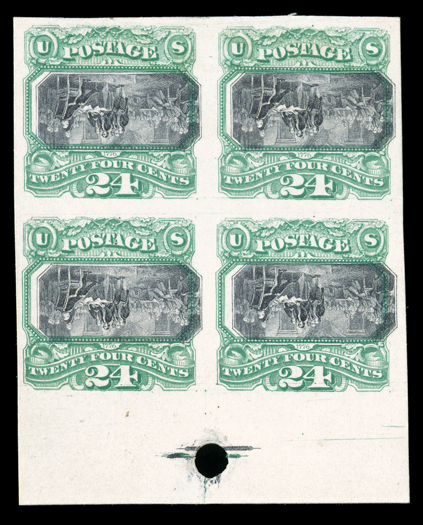 being incredibly bright and fresh, with outstanding colors and im#129aP4-122aP4, 15c-90c 1869 Pictorials, Centers Inverted, plate proofs on card, an absolutely fabulous complete matching set of marginal "registration marker" blocks of four, each being incredibly bright and fresh, with outstanding colors and impressions, and all four possessing exceptionally wide margins all around, including sizable sheet margins on one side which display the dual color registration markers and punch holes, simply superb.Only one sheet of 100 of each of the four values were produced with inverted impressions. At one time the famous collector, the Earl of Crawford, owned the complete set of sheets. These were subsequently broken into the imprint and plate number blocks of eight (two of each from the top and bottom of the sheets), only two sets of blocks of four and the remainder into singles. Our research indicates that one set of blocks has not remained intact, leaving this stunning matching set of registration marker blocks of four as the only intact set. As such, these are not only spectacularly beautiful but they are also among the premier proof rarities in United States philately.Given that only two blocks of four of each value exist, we find it a bit odd that the Scott catalog only gives a modest 10% premium over the value of four singles for a block of four. We cannot imagine that potential bidders for this incomparable set of blocks will not recognize this disparity and bid accordingly. (imagea) (imageb) (imagec) (Image) $49,000.00+