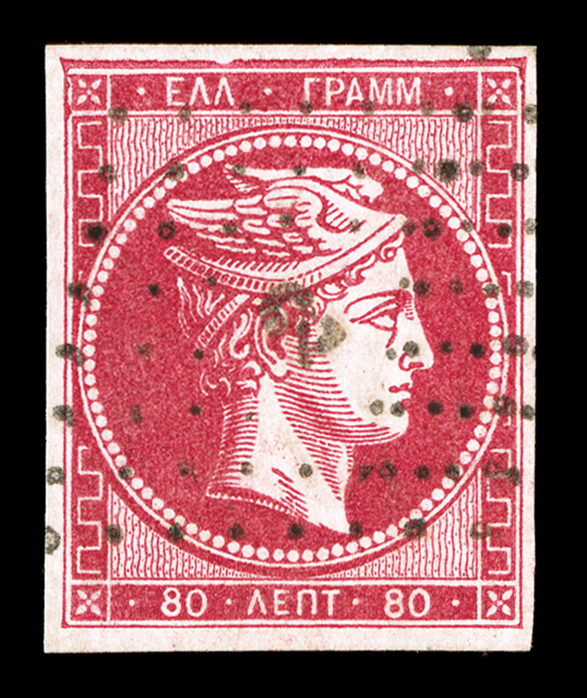 numeral 2 in grid of dots cancel, very fine (Michel 22 var.).#22b, 1862 80l Carmine on pale rose, "8" of "80" numeral on reverse Inverted, another used example, this one in a deeper shade, four full and balanced margins, intense color, neat numeral "2" in grid of dots cancel, very fine (Michel #22 var.). (imagea) (Image) $400.00