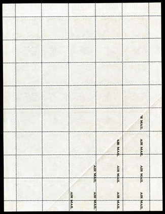 including full selvages, with a pre-overprinting fold that results in sixteS.G. #114a, 114b, 114c, 1929 3p Black and blue green air post, Ash printing, with overprint omitted and printed on the back (vertically), an amazing complete sheet of 40, including full selvages, with a pre-overprinting fold that results in sixteen stamps with the overprint omitted, and ten of these appear on the reverse, exceptionally fresh, o.g., all stamps never hinged, a few trivial perf. separations, very fine.This unique and incredible sheet contains fifteen errors, all of which are rarities in their own right. There are four horizontal pairs, one overprint omitted (S.G. #114a), three vertical pairs, one overprint omitted (S.G. #114b) and eight with the overprint on the reverse (S.G. #114c). This sheet represents a large percentage of the known errors of this stamp, particularly the overprinted on reverse variety.Without question the most important error multiple in all of Papua philately, as well as being one of the most phenomenal air post rarities of the world. Accompanied by 1971 RPS and 2007 Brandon certificates; ex-Sir Gawaine Baillie (Scott #C1b, C1c, C1e; $67,000.00+). (imagea) (Image) £73,000+