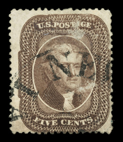 certificate.#30, 5c Orange brown, Ty. II, uncommonly well centered and margined, deeply rich color, complete strike of a grid in circle cancel, very fine; 1974 PF certificate. (Image) $1,300.00