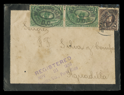 penalty cover, Aguadilla (2), Arecibo (4), including the only known railway provisional postmark and the only recorded example of purple "Registered/Nov 21 1898/Arecibo Sta., Porto Rico" handstamp, Bayamon (2), Caguas, Cayey, Fajardo, Humacao (2)