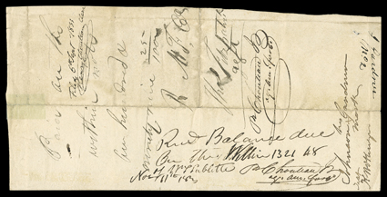 185   [American Fur Trade, 1830s] Interesting group of 11 letters and documents concerning the heyday of the fur trade in the American West, 1831-39. The names represented include Joshua Pilcher, Baptiste Roy, WL Sublette, and HL Dousman, with items to P Chouteau and K McKenzie. Est. $750-1,000