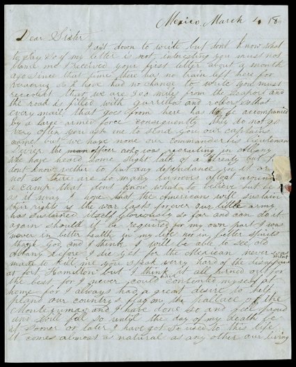 that section), all to his sister, Ann. He initially joins the army wit[Soldiers' Letters] Group of six American soldiers' letters from the Mexican-American War. Four are by John Cornock, who would later emigrate to California (see his letters in that section), all to his sister, Ann. He initially joins the army without telling his family and finds himself at Fort Hamilton, Brooklyn, whence he writes back to Albany. In the dragoons, he took part in the assault on Tulansingo, and briefly describes it. Another soldier, Benjamin Wingate, writes home to Indiana from Puebla in August 1847 to say that he is going to serve under Franklin Pierce and they are readying to move out. They would later fight in the Battle of Contreras, in which Pierce was wounded. "I have no doubt that be fore you read this letter that the fate of a many a blooming youth will be sealed...I expect to write my next letter in the City of Mexico." The final letter is by Charles W. Foster, who started the war as a private and would finish as sergeant, becoming a colonel in the US Civil War. With a letter by William R. Sellon from Saltillo, March 4, 1847, describing the capture of the town, the sorry state of Mexican conscripts, and Santa Anna's excuses: "He was forced into the fight by the Mexican Congress...They would not furnish him with money nor provisions." With another soldier's letter from Vera Cruz later that month. (imagea) (Image) Est. $750-1,000