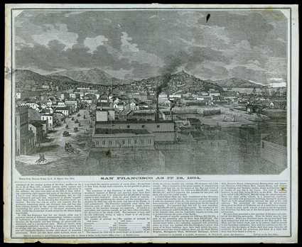 added a pen notation identifying the location of Oakland (pictureView of San Francisco in 1860, (Baird #317) Henry Payot, (before 10/10/1862). Sheets hinged at short end, unfolding to an 8.4" x 21.5" panoramic image. Two others known. Writer has added a pen notation identifying the location of Oakland (pictured as a barren hill in the distance). J.S.C. Cooper writes from Oakland, 10/10/1862, to his sister: "It is a fixed law of the Cal'a climate that all the girls who come out here under 15 yrs. grow up twice as strong as in the east with such rosy cheeks that you want to bite them by mistake for peaches & so tall that you are sure to think them at least 3 yrs older than they are." He continues very entertainingly on the subject! (Image) Est. $1,000-1,500