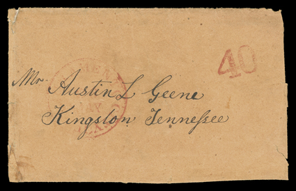red Sacramento, Cal26 May datestamp and matching 40 rate, cover[Georgetown Gold Samples, 1851] Georgetown California May 19th, 1851 dateline on letter from a miner enclosed within a buff cover to Kingston, Tennessee, entered the mails with red "Sacramento, Cal/26 May" datestamp and matching "40" rate, cover wear and faults on reverse, extremely fine content.The sender, L.B. Crow writes: "...This thing they call Gold diggin is a very disagreeable kind of work. A man has to work in mud and water most of the time..." He and his partner just made $300 in three weeks. "...Sunday is the main day to play cards and drink liquor. If a man commits murder or is caught steeling horses they will rais a mob and just take him right out to a lm and swing him right up with out Judg or Jury...There has been a grate distruction with fire a few days ago at San Francisco (May 4th)..." he then concludes with "I send you five small s(p)ecimens of gold dust in a small bit of paper."Amazingly, the five gold nuggets still remain with the letter affixed to a small piece of paper. (imagea) (Image) Est. $1,000-1,500