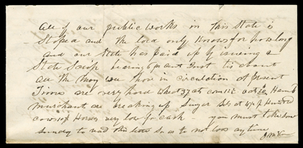Thompson of Keokuk, Iowa Territory, just a few miles south of Nauvoo acros[Plural Marriage after Smith's Death], Plural marriage, danger in the temple, and factionalism following Joseph Smith's death. Amazing content letter by non-Mormon, Mr. E. Thompson of Keokuk, Iowa Territory, just a few miles south of Nauvoo across the Mississippi River, May 26, 1846. Cover with Keokuk / I.T. postmark, and with 10-cent rate at right. Writing to a friend in Sing Sing, NY, Thompson begins by lamenting that Mormon relatives are heading west with the exodus led by Brigham Young. He explains that a daughter of that family, Mary Ann, has become one of Joseph Bates Noble's "Spiritual fixings." Noble is believed to have performed the very first plural wedding for Joseph Smith, marrying his own sister-in-law to the prophet. But Mary Ann suffered a miscarriage "and was crazy...and disturbing the whole neighbourhood...shouting to the utmost of her voice Oh! Brigham you've deceived me, you've deceived me (apostle Heber C.) Kimball...Noble's you've deceived me...(but I think such expressions quite sane)."Another with marital woes is Charles Wesley Wandell, (who would become estranged from the church under Young and is best known for helping expose its part in the Mountain Meadows Massacre). His wife is angry "in consequence of him wanting to have more wives, telling her she is keeping him from a great glory and that he will only be a dim star in the Celestial kingdom."Apostle Parley P. Pratt "is living in St. Louis altogether on the charities of the people...He is quite childish...Miss (Mary Ann) Merril & old Mother Pratt wanted to come down to Keokuk to take SB (steamboat) to St. Louis but when Prof. O Pratt returned home last fall from his eastern mission he put up at the Hotel & him & Miss M. in a private room the most of the time neglecting her work & much to the annoyance of Mr. Barnum the landlord." Pratt purchased a fancy carriage, trunks, and robes, "& paid for it out of Temple funds. The following morning he drove up to the entrance of the hotel (she having told Mrs. B that she was going to be married to a gentleman from the east) and Miss M jumps in." They headed west, "she being some 6 or 7 months advanced in pregnancy when they left."Miss Merrill would become one of Orson Pratt's wives. Thompson gives his colorful opinion of plural marriage when writing about endowment ceremonies, where the righteous received the gift of spiritual wives. The rites included theatrical re-enactments of biblical or Mormon stories. Thompson calls them a farce, adding: "that in the terrestrial kingdom...they took solem oaths & covenants that the man & woman would be true to each other, but when they got into the celestial kingdom they might have free course, run & be sealed - the keys of that kingdom was kept by (apostle) Mr. Ezra T. Benson & Mr. (John D.) Lee....acted the part of the devil. They said he did it to perfection NO DOUBT."Thompson gossips about Brigham Young being "at a ball in the winter time where Hannah Long was and asked her if she would not be married to him. She said she was willing" but her parents refused. "There was some dozen wanted her & as many wanted Eliza Parry. So the old folks told me, such a time of running in the time of the endowment scrape you can't imagine, worse than a lot of dogs after a slut." The LDS community had begun its westward exodus under Young, and "There is some six large flat boats constantly crossing the river with there Teams and Cattle...4 fifths of the Mormons have already gone...All is to leave Nauvoo...Most of the good houses have been sold to new comers." He has tried to rent to them but "the good mormons have broke a good many pickets off. I dont suppose there is over a dozen lots planted...in the whole city, for they burnt up most all of the fences."Thompson also relates a curious series of incidents surrounding the dedication of the Mormon temple in Nauvoo. It had been completed in haste, as plans to emigrate had already been made, with the consequence that when"it was dedicated to there god on the 1 2 & 3 of May - none admitted without paying a dollar each...The last time Brigham preached in the Temple...the lower pillars settled down some six inches & upper ones too...It made quite a crash. The people rushed to the windows & doors, but the first man that jumped out of the east window was B with two six shooting pistols in a belt on his side. .. At the time they was giving there so called endowments...the outer walls shook to that degree that they had to cease."With the Mormons leaving town, the temple was vandalized four months after this letter, and would be burned two years later, probably by one of Young's followers who wanted to erase any challenge to the planned temple in Utah. The LDS church had already begun to splinter into factions after Joseph Smith's death. While Young led the largest group west, his rival James Strang led a group to Wisconsin. A third faction under Sidney Rigdon had already relocated to Pittsburgh. Thompson explains, "Strang...claims to be the man that was appointed by Joseph - not ordained...Prest. Rigdon mentions about 20 times about being...ordained by Joseph. They had a conference about a month since..." Joseph's younger son William "Smith and his mother Emma & family are all from Strang. Prest. (William) Marks - J.E. Page" have all gone with Strang. Rigdonite Benjamin "Winchester wrote to Strang...if he would appoint him one of the 12 he would unite with him. Strang wrote that he neither wanted him nor his influence."Thompson may have confused a few rumors, for according to most sources, Emma Smith actually favored Marks, who himself favored Sidney Rigdon. Her family would stay in Nauvoo. James Strang's faction would ultimately settle on an island in Lake Michigan, where Strang was murdered in 1856 by disgruntled former followers; the Strangites and others would unite under Joseph Smith III, forming what would come to be called t