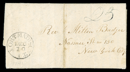 Home Missionary Society, in New York. The first, from Dubuque, Iowa[The "Destructive influence of Mormonism"], Nauvoo. Interesting content pair of letters by Presbyterian missionaries in Iowa to Rev. Milton Badger, the secretary of the American Home Missionary Society, in New York. The first, from Dubuque, Iowa Territory, April 5, 1842, is by John C. Holbrook. He complains of "the destructive influence of MORMONISM. Every minister knows that whenever God's people are revived, & put forth special efforts for the salvation of sinners, then the Devil stirs up his instruments to promote a revival of his work. Sometimes he uses Universalists; sometimes Infidels, & sometimes the Mormons."A Mormon had been interrupting the missionary's prayer meetings, addressing the congregation "to enlighten them in the mysteries of that system, & with the revelations" said to have been vouchsafed to Joe Smith, the prophet of 'the latter day Saints.'" The man had come to the mission for enlightenment, but it seems that Holbrook's doctrines could not attract him, for he would announce at the close of meetings that "There will be preaching...by one of the Elders of Israel, commonly called Mormons." Holbrook especially despises the doctrine that "literally NOW, 'signs shall follow them that believe,' &c., 'they shall speak with new tongues - shall lay hands on the sick & they shall recover' & that these are the evidences of real faith. They profess to perform these miracles." He goes on to complain in less indignant terms about competition from Catholics. Emendations throughout in ink show that this letter was adapted for use by the Missionary Society in one of its publications. Bottom fourth cleanly detached, with partial splits at other folds. The second letter, by J.A. Clark, Fort Madison, Iowa Territory, December 6, 1842, complains of the difficulty creating a lasting community on the frontier, but boasts that Clark's church has doubled in size. However, he must make "a very important point. I know of none in the territory more so & that presents more flattering prospects for ministerial success. The beast has already looked upon it with a covetous eye & Lieutenant Genral prophet Joe arrogantly claims it as his." He explains that the spot is below the rapids, where steamboats can visit longer into the cold season than points further north (presumably including Nauvoo). Fold wear including minor splitting. With a "Fort Madison / i.T." postmark. (imagea) (Image) Est. $500-750
