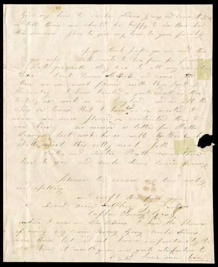 content Autograph Letter Signed Olive G. Frost, 3 pages, 4to, Nauvoo, I[Olive Frost, plural wife of Joseph Smith and Brigham Young], "You will perhaps say that our prophet is a false prophet...It is not so. This is the work of God."Exceptional content Autograph Letter Signed "Olive G. Frost," 3 pages, 4to, Nauvoo, IL, March 12, 1844. To her uncle, Capt. Joshua Grey, in New Orleans, she reports that:"Since I saw you I have traveled ten thousand miles by sea and land. I left my dear Father and Mother and spent two years in England with my Brother in law P.P. Pratt and sister Mary Ann Pratt, who were Missionarys to that country. But through the mercees of God my life has been spared (to) return to my own Native land and now residing in the Citty of Nauvoo with my Father and Mother and two youngest sisters. They are living in the same house with my Brother in law Pratt. We are all well. It is a fine Citty here only 4 years old menny hundred houses about ten thousands inhabitants nearly all belonging to the same Church an you will perhaps say that we are all a deluded people and our Prophet a false Prophet. But dear uncle it is not so, this is the work of God, we read in Joshua about the Lord would proceed to do a marvelous work and a wonder the wisdom of wise should perish &c. I believe this to be the work of God and that He has spoken from the Heavens in these last days and restored the priesthood as in ancient days, and that Joseph Smith is a prophet of God. I also sent you a Book of Mormon. A coppy from the records that Joseph Smith found which were hid up by a people who peopled this continant years before it were discovered by Columbus and Christ appeared to this and that Book is a record of that people. We read in palmns that truth should spring out of the Earth &c &c This may seem strong to you but I ashour you it is the truth of heaven." She invites him to visit now that boats are traveling regularly from New Orleans on the Mississippi River, adding that, "We have a fine view of the river about a mile from the river on a piece of ground near the Temple. …" Frost, Olive Grey (1816-45) had been a missionary for the Church of Jesus Christ of Latter-day Saints, traveling to England with her sister, Mary Ann, who was married to one of Joseph Smith's original apostles, Parley P. Pratt. Sometime after their return to Nauvoo in 1843 and Smith's death on June 27, 1844, Olive became the prophet's thirty-fourth wife. According to some authorities, Mary Ann was also married to the prophet at the same time. Remarkably, the present letter makes no mention of her marriage to Smith, though he would be killed in just a few months. It is said that Olive went mad with grief when her husband's body was brought back from Carthage. Five months after being widowed, she became the eleventh wife of Smith's eventual successor, Brigham Young. Olive had been wed to Smith for eternity and to Young for life; thus she would remain Young's wife until death, at which time she would join Joseph Smith in the celestial kingdom. It would not take long, for Olive had never enjoyed robust health and died, probably of malaria, on October 6, 1845, at age 28. Letter has two minor tears repaired with transparent paper, seal hole affecting one line, with some staining, but is very good overall. (imagea) (Image) Est. $7,500-10,000