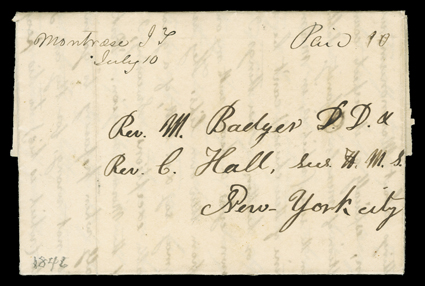 Boston as per red Boston, Mass16 Jul datestamp, about three months[Camp of Israel], "Camp of Israel, Winter Quarters Indian Territory April 1847" dateline on folded letter with integral address leaf carried overland and placed in the mails in Boston as per red "Boston, Mass/16 Jul" datestamp, about three months in transit, very fine.An excellent letter from Ursula B. Hascall relating to the departure of the Pioneer Company, and the ones that followed in which she travelled, with great detail on the hardship and suffering of the Mormons and life at Winter Quarters: "...I assure you the time has now arrived that we are preparing to pursue our journey. (We) expect to arrive at our place of rest (Salt Lake Valley) before we stop again, only for repairs &c. About two hundred pioneers started two weeks ago. …. There was ten men chosen to herd them (the cattle) and keep the Indians from killing them. Francis was one of the ten - had 2 dollars per head...There is companies organized of hundred and Captains of fifties and tens. We are going in brother Wallace's Company of fifty. The Woodburys are going with the same company. They are twenty miles from here. Thomas has been here and staid over night. Where William is they do not know. Brother Aikins family are at Garden Grove (Decatur Co. Iowa) some distance back. Samuel came on with brother Pond's family and died here away from father and mother. I suppose you have heard of the deaths in brother Ponds family. The children are all dead but Elizabeth Loenza. When they were on the way here they turned from the main road into a settlement where he and Samuel could earn two dollars per day with their teams. It proved to be an unhealthy place. They were all taken sick and they came away as soon as they could, but they were unable to take care of themselves on the road and suffered for the want of care. Lowell died before they arrived, the rest lived to get here and then dropped away one after another. Sister Pond has not recovered and I fear she never will. Brother Ponds health is very poor. Sister Clark died on the way here. She wore her self out with hard work...Yes, sooner or later the Lord will avenge the blood of his martyred Profhets and persecuted Saints, unless they repent and restore their rights. Irene read President Polks message - it is as harmless as milk and water...." Ursulia then asked about various people back home. Regarding her Mother she comments: "Tell her to enjoy herself and be prepared for a part in the first resurection and live with Christ on the earth a thousand years. Is it not worthy of our whole time and talent? ....Give my respects to Grandfather and mother Andrews. Tell them the Mormons have built one of the best grist mills that ever was run in the States. Although this is Indian Territory when they leave it the next company (of Mormons will use it and so on until all the mormons have passed along. …. I went with the wives of the elders that were sent on missions, widows and soldiers wives… I send this (letter) by a sister that is going to Boston to visit her friends. (She) returns in October. Her name is Sabra Granger. Direct your letters to Francis M. Pomeroy Huntsackers Ferry, Austin postoffice, Atchinson County, Missouri, to be forwarded to the Camp of Israel. Your affectionate U B M. I send you a piece of my new bonnet the handsomest one you have seen."When the Mormons began their exodus from Nauvoo in February of 1846 they established camps across Iowa, such as Mount Pisgah, Garden Grove and Winter Quarters on the west side of the Missouri River, near present day Florence, Nebraska. It was from Winter Quarters that Brigham Young led the Pioneer Company of 143 men and three women in 70 horse drawn wagons in April of 1847. (Image) Est. $1,500-2,000
