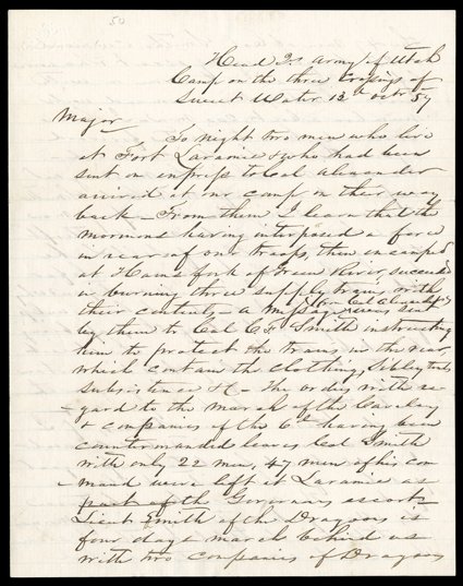 the US 10th Infantry, 6 pages, 4to, Camp Floyd, Utah Territory,[Mountain Meadows Massacre], "murders too horrible to be told & perpetrated by the authority of the Church." Astonishing content letter by Charles Brewer, an assistant surgeon in the US 10th Infantry, 6 pages, 4to, Camp Floyd, Utah Territory, March 31, 1859. With original cover bearing Camp Floyd postmark and 6-cent rate. Brewer writes in outrage to Dr. Abram Claude in Annapolis, MD: "You are already aware of the horrible state of morality among these people. I can call by names individual cases of men marrying...a mother & her daughters, a man his own 5 & 6 nieces, & even horrible to relate living with their own children: this they do they say to propagate rapidly & make tabernacles for souls which they suppose to be flying about in the air like nats looking for an abode.""Evidence of murders too horrible to be told & perpetrated by the authority of the Church are becoming unraveled. It is now proved that at the massacre of the Emmigrants at the Mountain Meadows, after the men were murdered by the Mormons, the Indians were called in to do the bloodier part of the butchery, and Mormons have told me that defenceless women & children clung in numbers around the legs of the brutal savages in vain imploring mercy and offering themselves as slaves. They were not only scalped, but according to Mormon custom their throats cut from ear to ear & heads severed...The Juries & grand juries are composed of Mormons. This too sanctioned by the Governor who is the pot companion of the Traitor (Brigham) Young & whose private secretary is married to a mother & her daughter.""Judge Sinclair with volumes of evidence of crime before him was forced to adjourn his court as a failure. Judge Cradlebaugh is now using his strongest efforts. The bishops of Provo, Springville & other cities were engaged in the murders. Guilt has driven them to the mountains. When officers approach a city to arrest criminals the alarm is sounded from the walls with a bugle & the criminal is shielded & is assisted to escape. Even when criminals are caught, the legislature have in every way attempted to embarrass the execution of Justice. AT LAST the Judiciary have been vested with the power of calling upon troops to act as a posse comitatus. The Mormons are in a state of rebellion. In their tabernacles they pray that pestilence & famine may destroy the army & foreign power subvert the Government. They preach & practice excommunication against those who sell to the army. Such are the people just pardoned from treason (by President Buchanan, who had just botched a show of military force) Are they not, TRAITORS still?"On September 7, 1857, a group of about 140 emigrants to California were camped at Mountain Meadows, in need of rest and forage before proceeding, since the people of Utah Territory had unexpectedly refused to sell them the food and supplies they had counted on. They were suddenly besieged by hundreds of men who began to fire on their camp. They rallied, but soon their ammunition was used up. An emissary from the attackers arrived with a white flag and offered them the choice of surrender. They complied, and the men, women, and children were marched out of camp in separate groups. Once in the clear, all but the smallest children were shot. The children under eight years old were distributed among a few Mormon families. Brigham Young and his followers blamed the attack on local Native Americans, but it soon became clear that the large majority of the killers were white men, some of whom had darkened their faces. Though several men were indicted, Governor Cumming wished to let the matter drop and the Latter-day Saints actively hindered the investigation and subsequent prosecution using all the methods Brewer lists here. As time wore on, Young distanced himself from the men who were involved (and who thought that they were acting under his orders). In the end, only one man, John D. Lee, was convicted for his part in the massacre, and was executed in 1877, twenty years after the crime. Two years after writing this, Brewer would also be in a state of rebellion, resigning his commission and enlisting in the Confederate army. (imagea) (Image) Est. $1,500-2,000