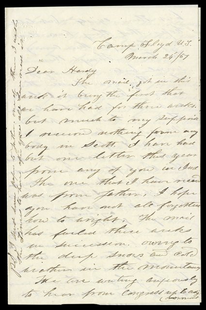 of Lexington, Indiana, that the mail has been delayed by cold weather[Mountain Meadows Massacre], Angry content letter by Lieut. Benjamin Wingate of the 5th US Infantry, Camp Floyd, Utah Territory, March 24, 1859. He tells his friend A.L. Hardy of Lexington, Indiana, that the mail has been delayed by cold weather and deep snow. The soldiers hope Congress will send them better rations, but Wingate doubts it. They have heard: "from our Col. who is in Washington, that the 5th Infty would be ordered to New Mexico or Orazona this spring. I hope it will be to New Mexico...I have seen enough of mormonism. They are a set of damned sons of bitches and if justice could be done all the head devils would be hung higher than havon. But justice cannot be had. There is not the slightest possibility of the judges being able to inforce the laws. Judge Cradlbough convened his court about two weeks ago at Provo City and yesterday he discharged the grand jury telling them at the same time that they were a set of perjured damned scoundrels. The only bills they could find were against two Indians notwithstanding the judge in his charge to them pointed out several cases of murder and informed them where they could find evidence but no, they could find no bills against Mormons. The judge I believe intends to adjourn his court to this place and make an other effort...I consider the Mormon difficulty no more settled at this time than it was Eighteen months ago. The only difference is that there is a considerable force of United States troops in the Territory...If the government would only say the word for us we are almost spoiling for a mess with the heathen devils."With original cover bearing Camp Floyd, U.T. postmark. Wingate had begun as a private in the service and would ultimately reach the rank of captain and brevet major during the Civil War. He died in June 1862 of wounds suffered months before at the Battle of Valverde in New Mexico. Also an outstanding content manuscript document, a true copy of a statement by Judge Cradlebaugh from the bench, in response to a supposed "proclamation" by Governor Alfred Cumming. Cumming protests the presence of US troops in the vicinity of the Provo courthouse, where the judge presides. Cradlebaugh's reply is savage: "Governor Cumming speaks of a Company...being stationed around the Court House...and also of several Companies...in Sight of the Court House. He also says that the presence of these soldiers has a tendency...to terrify the inhabitants...also to subvert the ends of justice...I have only to say...they are stationed near the court House and on one side of it. The additional troops referred to as being within sight of the Court House, are at least four miles distant...In regard to the inhabitants being terrified...those who seem to have been stricken with terror have fled the country on account of crimes committed by them and the fear of just punishment...Among them are...several of the jurors, Presidents of 'Stakes', Bishops and also officers of the Territory." Furthermore, justice has been subverted by intimidation of witnesses by the locals, and some witnesses have asked the army not to leave, fearing they will be killed. (imagea) (Image) Est. $1,000-1,500