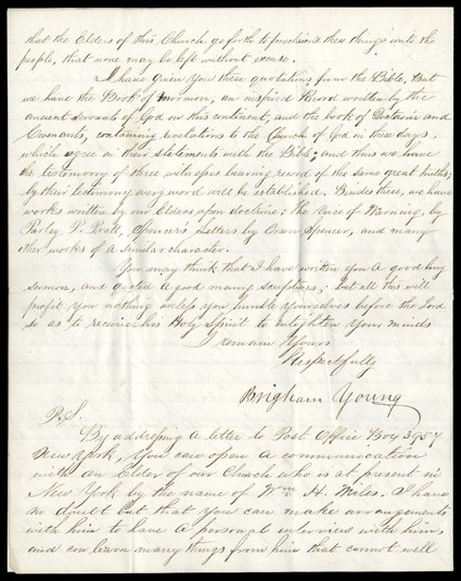 gentleman in New York that he is pleased to know that you have take[Young, Brigham], Lengthy, religious content Manuscript Letter Signed "Brigham Young," 6-1/5 pages, 4to, Great Salt Lake City, Utah Territory, October 31, 1864. He writes to a gentleman in New York that he is "pleased to know that you have taken pains to carefully read and investigate our doctrines and principles besides perusing what our enemies have to say. You inform me that you and your friends desire to become Mormons and that you wish to ascertain if the project is feasible. We have Elders in the East who would readily administer the ordinance of baptism the pre-requisite being, that you believe in Jesus Christ, the Son of God and the Saviour of the world, and repent truly and sincerely of all your sins. You see by this that the project of your becoming Latter-day Saints or 'Mormons is quite feasible. If you go forth and are baptized and also have hands laid upon your heads for the reception of the Holy Ghost by one who has the authority you will receive that spirit, and it will bear testimony to you that you have obeyed the Truth. It is by taking this course, that I and all the Latter-day Saints who have attained knowledge respecting the gospel of Jesus, know that the world called Mormonism, is the truth of Heaven, the gospel of salvation. Jesus said 'If any man will do his will, he shall know of the doctrine, whether it be of God, or whether I speak of myself. This is the rule which he gave unto the people when he was on the earth, and by obeying which, they obtained the knowledge that he was indeed what he professed to be ... the Son of God." He gives other, more direct biblical support for the doctrine of receiving the Holy Spirit before explaining, "The apostacy of man, through the changing of these ordinances and the transgressing of the laws of God, caused the Holy Ghost and its gifts and the power of God to be withdrawn from the midst of mankind for many generations. But the Lord had predicted, by the mouths of his Holy prophets, that the time would come when he would break the silence. The revelator John, in the 6th verse of his 14 Chapter says that 'he saw another angel fly in the midst of heaven, having the everlasting gospel to preach unto them that dwell on the earth' The mission of this angel to the earth was to restore again the principles and power which had been withdrawn and usher in the work which should prepare mankind and the earth for the coming of the Son of man." ... (additional extensive text not transcribed here) "… Besides these, we have works written by our Elders upon doctrine: The Voice of Warning by Parley P. Pratt, Spencer's Letters by Orson Spencer, and many other works." In the postscript, Young tells his correspondent how to contact William H. Miles, an Elder who is in New York. The postscript appears to bear a secretarial signature on Young's behalf, "B.Y."Pin holes at top of pages, with fold wear including very minor separation at edges, and some soiling. Very Fine.Young, Brigham - American religious leader (1801-77); a prominent member of the Latter-day Saint community upon the death of prophet Joseph Smith, he soon emerged as the leader of the largest faction; planned and led the great exodus to the Utah Territory; presided during the period of greatest conflict with the US government, including the "Utah War" and the Mountain Meadows Massacre; founded the University of Utah and Brigham Young University. Young's letters are not common, but those with substantial religious content are rare indeed and naturally of exceptional interest. (imagea) (Image) Est. $4,000-5,000