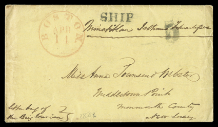with Letter bag of the Brig Icarian directive, with letter datelin[Tehuantepec Route, the last mail], two covers to the same Middletown Point, N.J. address, both with original letters, first with manuscript "Minatitlan Isthmus Tehuantepec" and with "Letter bag of the Brig Icarian" directive, with letter datelined "March 13, 1856", entered the mails with red "Boston/Apr 11" datestamp, "SHIP" and "5" due handstamps, the second with manuscript "Tehuantepec Mexico Sept 29, 1859" and carried on the last mail via Tehuantepec to New Orleans, where it entered the mails with Oct. 10, 1860 datestamp and matching "Steamship/10" handstamp, both very fine.The writer, Charles Webster, was the U.S. Consul and agent for the Louisiana Tehuantepec Co. at Tehuantepec, Mexico. In the 13 March, 1856 letter he writes his sister Anna that the Mexican Government has made a contract with a man named Smith to construct a plank road across the Isthmus, and that work will probably commence in two or three months, and further, that the small steamers for the navigation of the river Coatzacoalcos are nearly complete. In the 29 September, 1859 letter he writes: ”The mail will leave in a few moments for Minititlan and New Orleans, and as the contract with the Tehuantepec Company expires on the first of October, I greatly fear it will be the last direct opportunity I will have for some time"...[I am] ”rather poor in pocket...from the failure of the Louisiana Tehuantepec Company to pay its debts - They owe me some $4000.” He hopes he will get paid "as the company besides owning the valuable privilege of the exclusive transit on this Isthmus for seventy years, has some half millions of acres of land - all of which is liable for its debts contracted in Mexico,..." (imagea) (Image) Est. $500-750