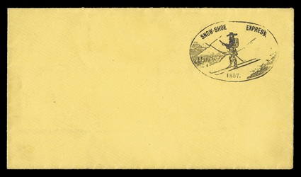 the mails with double circle Downie Ville, CalMar 19, 67 datestCook's Express, Paid, snow shoe expressman in the mountains illustrated printed frank on yellow cover to Camptonville, California with 3c Rose (#65, pre-affixing crease), entered the mails with double circle "Downie Ville, Cal/Mar 19, '67" datestamp, very fine; the unique recently discovered example; illustrated and discussed in Chronicle 213 (January, 2007) on pages 71-76.This recently discovered Cook's Express frank is exactly identical to the printed frank of Zack's Express, both operating out of Downieville. Granville Zachariah began his express about 1 January, 1865. Newspaper reports from the Downieville Mountain Messenger indicate that George E. Cook had taken over the "snow shoe express line" between Downieville & La Porte as of December 15, 1866. The Meadow Lake Sun of 15 June, 1866 reports that Tibbitts and Zachariah were running a Saddle and Pack Train into Meadow Lake. The Nevada Daily Gazette on 20 November, 1865 reports that Tibbetts had employed a man to carry the winter express on Norwegian snow shoes, which were superior to those used in Canada. That man was Granville Zachariah. Both expresses were short lived to about 1870. Both most likely had their covers printed in the work shop of the Mountain Messenger and both worked with the postmasters at the ends of the Downieville - La Porte route. (Image) Est. $5,000-7,500