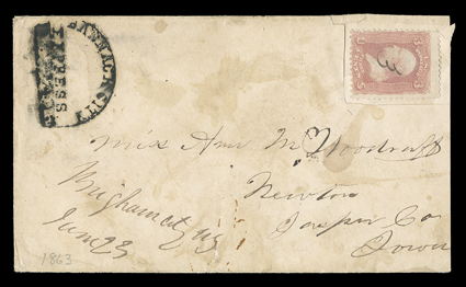 lot also includes four other faulty covers to the same recipient, one wBannack City Express, bold semi-circular handstamp on cover to Miss Ann M. Woodruff at Newton, Iowa, cover with light stains and stamp cut out and replaced, very fine strike; lot also includes four other faulty covers to the same recipient, one with manuscript "Bannack City Exp" endorsement with 3c Rose (#65) that entered the mails with "Salt Lake City, U.T./Apr 16" datestamp, another one with manuscript "Bannack City Express/Feby 9, 1863" endorsement that entered the mails with manuscript "Brigham/July 24" postmark, plus seven letters to his sister, two 1862 from Great Salt lake City, three 1863 from Bannack City, one 1866 from Fort Kearny and one 1870's from Leavenworth.The February 11th, 1863 letter by Mr. Woodruff from Bannack City reads in part: "...I have heard the Ex (Express) by which the last one (letter) was sent was killed by the Indians...Our first work was to build a cabin...Since then I have been engaged in mining...prospects so far are flattering...The next claim below us will probably yield Ten Thousand dollars...Those owning claims who are washing with rockers are making from 5 to 50 dollars per day...I have seen as high as 21 dollars panned out of one pan of dirt and from 4 to 10 dollars is not uncommon..." (imagea) (Image) Est. $1,000-1,500
