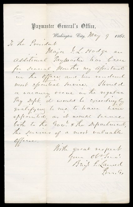 Washington, May 14, 1862. He responds to an ALS from Paymaster General Benjam[Abraham Lincoln, regarding a Paymaster appointment] May 14, 1862. Autograph Note Signed "A.. Lincoln" as President, 2/3 page, 16mo (on verso of a folded octavo sheet), Washington, May 14, 1862. He responds to an ALS from Paymaster General Benjamin F. Larned, who requests that "Major J.L. Hodge an additional Paymaster has been for several months my assistant in the office, and has rendered most essential service. Should a vacancy occur in the regular Pay Dept., it would be exceedingly gratifying to me to have him appointed". President Lincoln writes that "I am willing for the appointment within indicated, to be made, so soon as it can consistently with what I have already said for others." In very good condition. There is some spotting on the letter, but the panel with Lincoln's note is exceptionally clean and will display beautifully.Among the most tiresome of Lincoln's duties as president was seeing to the mass of political appointments that at the time were his to distribute. The Executive Mansion was beset by hundreds of supplicants every day, especially in the early days of his administration. Even with the dedicated assistance of his secretaries, John Nicolay and John Hay, it was exhausting keeping up with their demands. By the time of this request, things had quieted down to a degree, and naturally the endorsement of the paymaster general himself must have had weight. (imagea) (Image) Est. $3,000-4,000