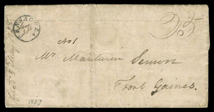 endorsed On ServiceTho. WrightPay Master and manuscript Free, thisPensacola, Florida Territory, two different postmarks on folded letters with integral address leaf , first straightline "PENSACOLA/June 24." on 1822 cover to Washington City endorsed "On Service/Tho. Wright/Pay Master" and manuscript "Free", this being the earliest recorded territorial period usage of this postmark, the second with "Pensacola." in small circle with manuscript "Jany 30th" on 1827 cover to Fort Gaines with manuscript "25" rate, this being the only known example, some toning and both postmarks affected by light file folds, very fine for these. (imagea) (Image) Est. $750-1,000