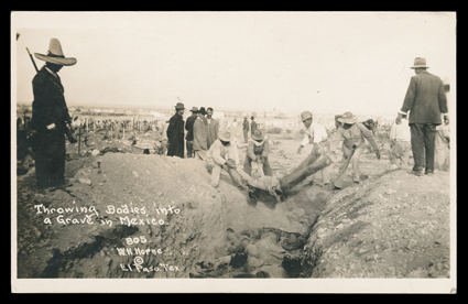 Pershing sought to capture Mexican rebel leader Pancho Villa after some raid[Pancho Villa Expedition] Excellent group of photographs, most of them period postcards from the border clashes between US forces and Mexican rebels in 1917 as Gen. John Pershing sought to capture Mexican rebel leader Pancho Villa after some raids on American border towns. With many photographs of Villa and his men, and quite a few of US Soldiers and Mexican regulars. 69 postcards in all, including about a dozen or so that are unrelated but from the same period. Quality is uniformly excellent. Some images not for the faint of heart. (imagea) (imageb) (Image) Est. $300-400