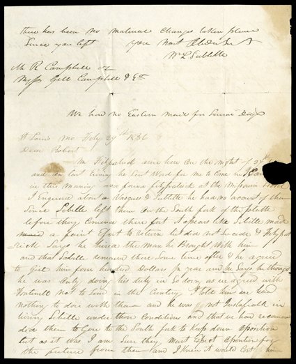 it bear an April 28 postmark). He writes Robert Campbell at Gill CampbSublette, William, Excellent business content Autograph Letter signed W.L. Sublette," Sulphur Springs, MO, and St. Louis February 27 and 29, 1836 (though probably misdated, as it bear an April 28 postmark). He writes Robert Campbell at Gill Campbell & Co in Philadelphia, "On the morning of the 26th Sarpey came to Miltons room and requested me to Come to the office and get the two thousand Dollar Check as I wrote...they had promist me On Cabene's (Jean-Pierre Cabanne) note. I...got the Check...which I here Enclose. There was nothing more Said about Fontinelle Fitzpatrick & Cosnote ... The American fur Co. has got all his papers but Cant make any thing out of them without his asistance and he Cant leave off Frolicking for two days to arainge them. Milton apears anxious to have Every thing Setled and Keeps Verry Steady him & Henry Fraeb. There is not much doubt but Fitzpatrick will be down Shortly from what Sarpey tells me. The American Fur Co. appears determined to doe nothing more for Fontinelle, and I can't blame them much...." He adds on the 28th (which he dates as 29th) "Mr. Fitzpatrick arive here ... I enquired about Vasques & Sublette. He had no account of them since Sebille left them On the South fork of the Platte before they Comence there fort. It apears like Sibille made a faint Efort to return...Says he hired the man he Brought With him...He agreed to Give him four hundred Dollars pr year and he Says he thought he was Only doing his duty...as we agreed with Fontinell not to Send in the Cuntrey. I told him...he was not Justafiable in hiring Sebille...We had recommended them to goe to the South fork to keep down Oposition...In Stead of Keeping down Oposition he was pitching it On...I have been in Fitzpatricks Company but five minutes & have talk Verry plain to him. I told him Fontinell promis things to us which he had not fulfiled &c...I will push the arangemt. of Our Note and if they don't agree to pay it I will then make arangemt. for the Mountains." Sublette and Campbell had begun among the original group of men sent fur trapping by William Ashley, and quickly realized that all the money was on the St. Louis end of the venture. They formed the Sublette & Campbell Company, whose principal business was supplying trappers. Fontenelle would soon be working for the American Fur Company, like many traders who tried to go into business on their own. From his business practices as mentioned here, it is not terribly surprising. (imagea) (Image) Est. $1,500-2,000