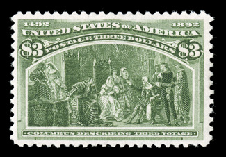at bottom right, otherwise and extremely fine jumbo.#239, 30c Columbian, spectacular appearing mint single, sporting humongous margins and being exceedingly well centered within them, rich luxuriant color, o.g., tiny perf. scuff at bottom right, otherwise and extremely fine jumbo. (Image) $240.00