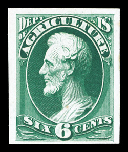 (Agriculture, Executive, Interior, Justice, Navy, State, Treasury and#O4TC/O86TC, 6c Lincoln design officials, "Atlanta" trial color plate proofs on card, complete set of all five colors for each of the Departments that issued a 6c Lincoln stamp (Agriculture, Executive, Interior, Justice, Navy, State, Treasury and War), each brilliantly fresh and mostly well margined, a couple of proofs with trivial hinge thin spots, largely very fine, except for the 6c Navy which is damaged and has not been counted in the catalog value; these proofs were displayed at the International Cotton Exposition held in Atlanta, Georgia in 1881, only one sheet of one hundred was printed in each of the five different colors. (imagea) (imageb) (imagec) (imaged) (Image) $1,950.00