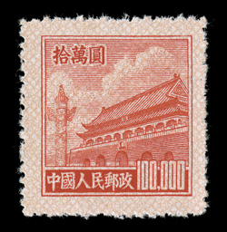 1274 og 85-94 85-94, 1950-51 $100.00 to $5,000.00 Gate of Heavenly Peace fourth issue cplt., without gum as issued, fresh and well centered, very fine set.#85-94, 1950-51 $100.00 to $5,000.00 Gate of Heavenly Peace fourth issue cplt., without gum as issued, fresh and well centered, very fine set. (Image) $330.00