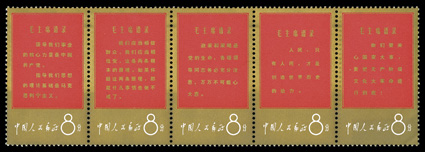 1293 nh 996a 996a, 1968 8f Directives of Chairman Mao strip of five, post office fresh, with strong and unfolded perforations, perfect white o.g., n.h., extremely fine.#996a, 1968 8f Directives of Chairman Mao strip of five, post office fresh, with strong and unfolded perforations, perfect white o.g., n.h., extremely fine. (Image) $3,000.00