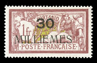 very fine for this much more elusive than its catalog value would in#32a, 1906 10Fr Orange brown on green, with inverted Chinese characters, a select mint example of this seldom offered overprint error, surprisingly fresh, o.g., lightly hinged, very fine for this; much more elusive than its catalog value would indicate; signed Marquelet and accompanied by a 2000 Behr certificate; ex-Gibralter (Yvert #34; €1,800). (Image) $1,600.00