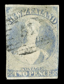 fine appearance. Sc. 22 S.G. 83, £800.2d. pale ultramarine with good to large margins all round and showing trace of adjoining stamp at upper right, cancelled "9" at New Plymouth; small thin towards top though of fine appearance. Sc. 22; S.G. 83, £800. (Image) Est. $300-400