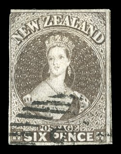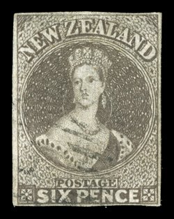 at top and soiled in places, all of minimal consequence when one cons3d. lilac, unused without gum, clear to large margins all round except at upper left, of fresh bright color and of striking visual appearance; crease at lower left corner, thin at top and soiled in places, all of minimal consequence when one considers the importance and calibre of this delicate stamp. An outstanding and beautiful looking example of this highly prized and hugely important stamp, of which only two examples are recorded. One of the most important stamps in the Joseph Hackmey collection which has been lacking from so many of the great collections of New Zealand, and one the rarest of all British Commonwealth classic issues. Friedl (1976) and Holcombe (1991) Certificates. Sc. 23; S.G. 84, £50,000. provenance: Mann, Harmer, Rooke & Co., October 1933, "Samos, June 1991,"Antipodes", October 1988 (Image) Est. $40,000-50,000