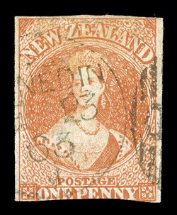 leaving much of face clear. An attractive example of this rare1d. orange-vermilion with good to large margins and showing trace of adjoining stamp at lower right corner, good strong color and neatly cancelled with "dunedin" in oval of bars leaving much of face clear. An attractive example of this rare stamp. Sc. 21; S.G. 81, £2,500. (Image) Est. $1,000-1,500