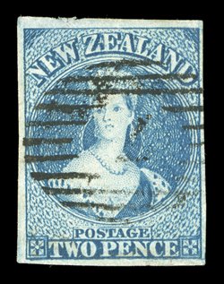 neatly cancelled 7 at Wellington. R.P.S.N.Z. Certificate (1961) for2d. dull deep blue, two slightly differing shades, one with small to good margins and cancelled "1" at Auckland, the other (right margin repaired) showing Row 8/11 re-entry and neatly cancelled "7" at Wellington. R.P.S.N.Z. Certificate (1961) for the first. Sc. 26a; S.G. 96. (imagea) (Image) Est. $300-400