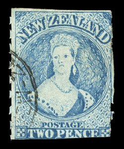 fine appearance for this rare stamp. R.P.S. Certificate (1945). Sc. 27a1d. carmine-vermilion with roulettes on three sides and imperforate at right giving a well-balanced appearance, clearly cancelled "1" at Auckland; thin at left side though of fine appearance for this rare stamp. R.P.S. Certificate (1945). Sc. 27a; S.G. 101, £3,000. provenance: C.W. Meredith, March 1960, Charles Williams, November 1947, Harry Lacoste Bartrop, October 1984 (Image) Est. $500-750