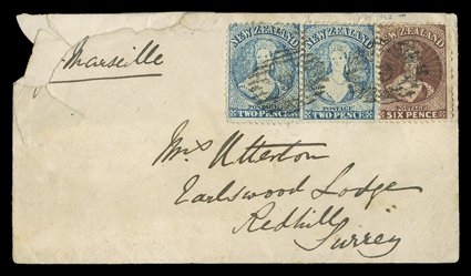 (12.1) on reverse scarce and attractive. Sc. 34, 36 S.G. 119, 122.1865 (8 Nov.) envelope from New Plymouth to Redhill, bearing 4d. deep rose and 6d. red-brown each clearly cancelled "9" and with despatch towards left, Dover transit c.d.s. (12.1) on reverse; scarce and attractive. Sc. 34, 36; S.G. 119, 122. (Image) Est. $1,000-1,500