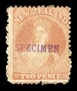 part original gum, otherwise fine. R.P.S. Certificate (2006) foHandstamped "specimen" (N.Z. Handbook Type B) in sans-serif capitals, 15x1.75mm.: 1864-67 3d. and 1/-, 1871 1d. and 6d., and 1872 no watermark 2d. and 4d., all but the 2d. with part original gum, otherwise fine. R.P.S. Certificate (2006) for 2d. provenance: Gerald Ellott (imagea) (imageb) (imagec) (imaged) (imagee) (Image) Est. $200-300