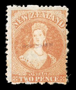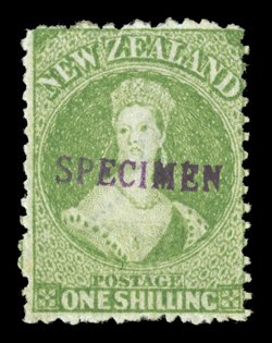 gum fine. provenance: Gerald EllottHandstamped "specimen" (N.Z. Handbook Type A) in seriffed capitals, 14.5x2.25mm.: 1864-67 3d. and 1/-, 1871 1d. and 6d., and 1872 no watermark 2d. and 4d., all with part original gum; fine. provenance: Gerald Ellott (imagea) (imageb) (imagec) (imaged) (imagee) (Image) Est. $200-300