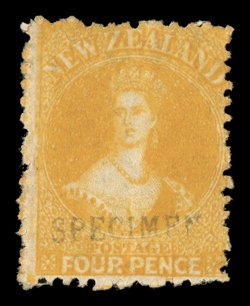 last with part original gum, otherwise fine. R.P.S. Certificate (Handstamped "specimen" (N.Z. Handbook Type A) in seriffed capitals, 14.5x2.25mm.: 1864-67 3d., 1871 6d. (2), and 1872 no watermark 2d. (2, one retouched) and 4d., all but the last with part original gum, otherwise fine. R.P.S. Certificate (2006) for three. provenance: Gerald Ellott (imagea) (imageb) (imagec) (imaged) (imagee) (Image) Est. $150-200