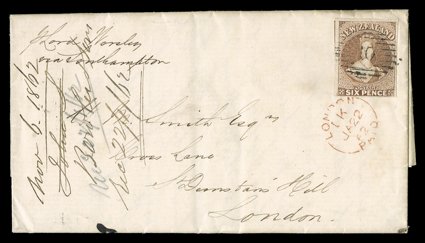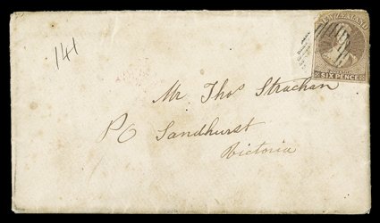(9 Nov.) entire letter from Wellington to London, bearing 6d. brown1860 (3 Nov.) envelope from Auckland to York, bearing 6d. brown with three good to large margins (faults at left) cancelled "1", despatch and arrival (19.1) on reverse, and 1861 (9 Nov.) entire letter from Wellington to London, bearing 6d. brown with good to large margins (partially lifted from cover and defective though of good appearance) clearly cancelled "10" and tied by London Paid c.d.s. (22.1). B.P.A. Certificate (1990) for the latter. Sc. 9; S.G. 13. (imagea) (Image) Est. $200-300