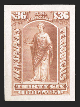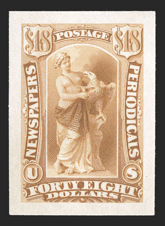 unique essay for the 1875 Continental Bank Note Co. issue and is not#PR16-E, Allegorical Justice, black die essay with blank value tablets on India paper mounted on 16x40mm card, adhesion on the reverse of card, fine; this is believed to be a unique essay for the 1875 Continental Bank Note Co. issue and is not as yet listed in Scott. (Image) Est. $750-1,000
