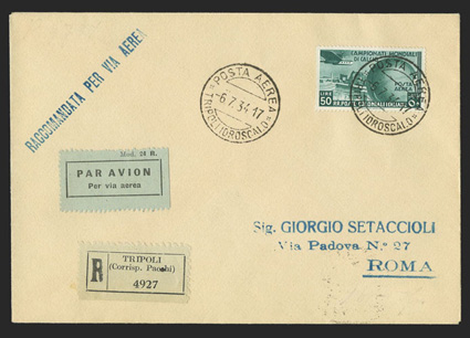 postmark to Rome with arrival backstamp, the second also a register#C29-35, 1934 50c-50L 2nd World soccer championship, two covers, one a registered air mail cover franked by the 50L value and tied by clear "Posta Aerea/Tripoli Idroscalo/6.7.34" postmark to Rome with arrival backstamp, the second also a registered air mail cover with 50c-25L (the other six values from the set), plus the 5L Brown regular issue (#49), all tied by six strikes of "Posta Aeria/Tripoli Idroscalo/19.6.34" postmarks to Rome with arrival backstamps, both fresh and extremely fine; Scott catalogs the complete set on one cover for $1,800.00 (imagea) (Image) Est. $400-500